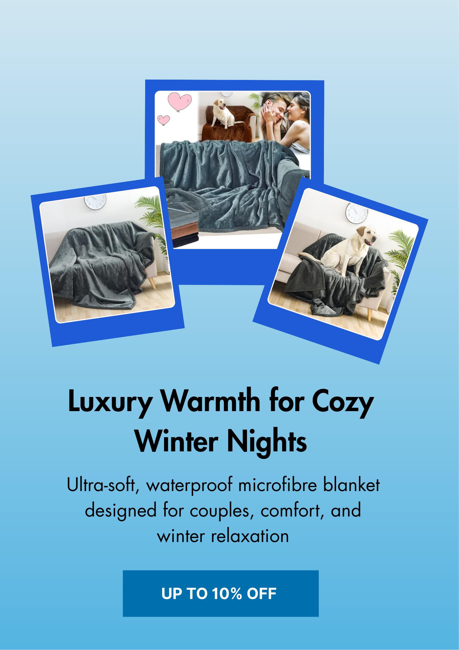 Our premium waterproof microfibre blankets are designed for ultimate warmth, softness, and durability. Large enough for couples, easy to care for, and luxuriously cozy, they turn every winter moment into comfort and style
